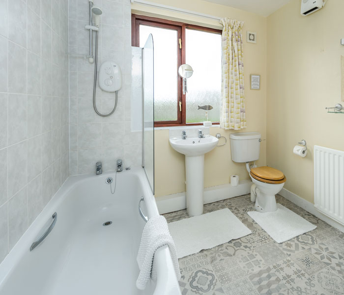 - Bathroom with shower over bath, toilet & basin